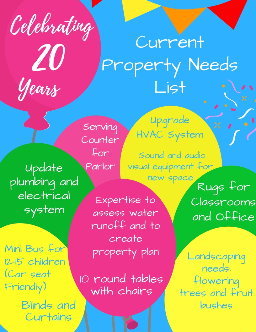 This year, Heartworks and Jubilee Academy celebrates 20 years of ministry. We are excited to announce our expansion in our current property and look forward to what God will do in the next 20 years! As Jubilee Academy serves more children and their families, would you consider donating any of the services or items from our above “Current Needs List”?